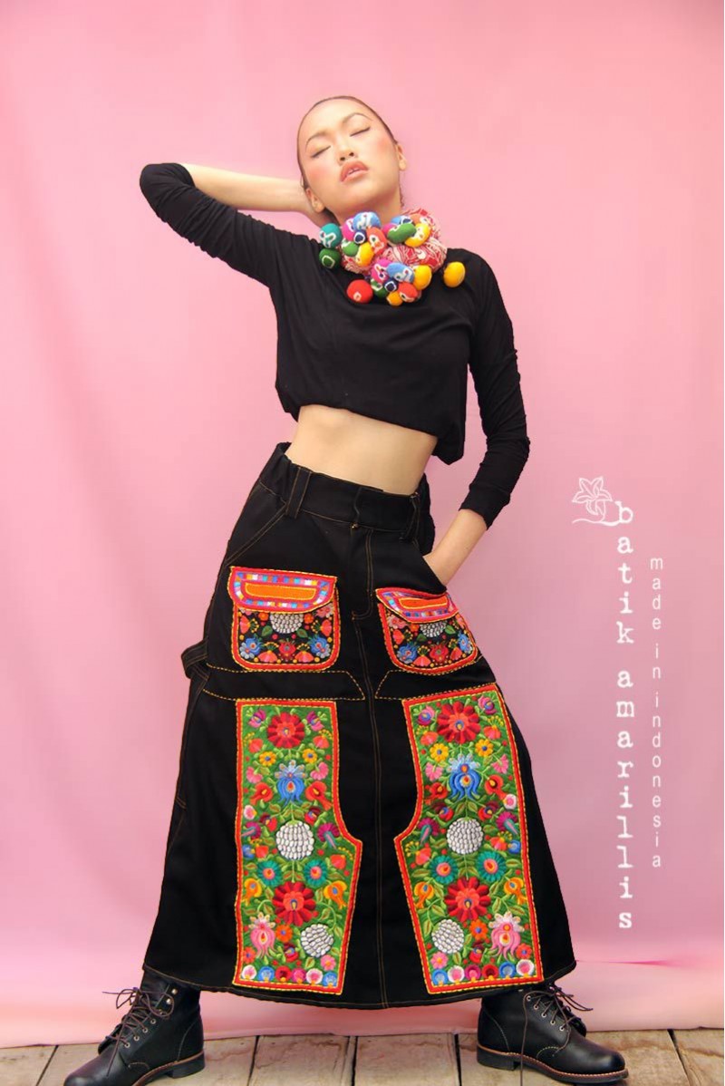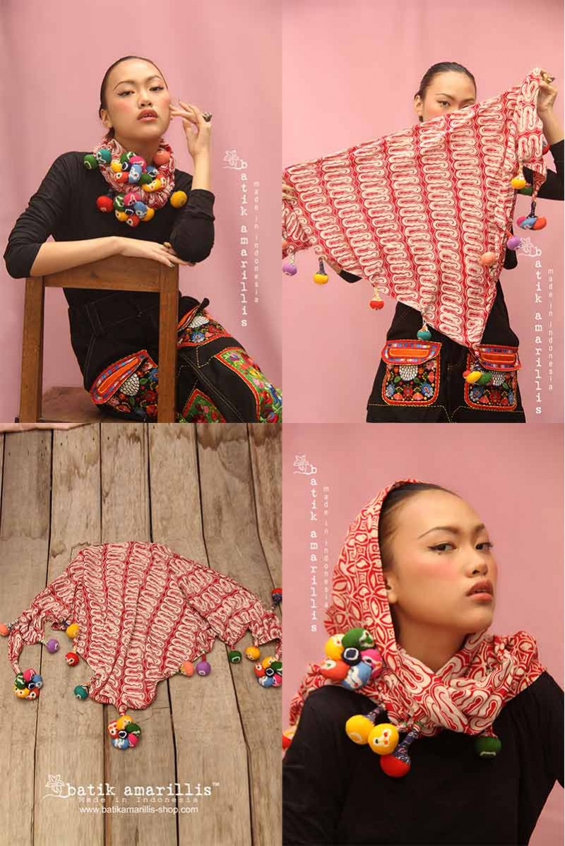 this unique 2 sided scarf is accented with our signature "jumputan" 'Lollies' and flower, this scrumptious shawl is your best accessories for all year round! Material : hand stamped batik Cirebon