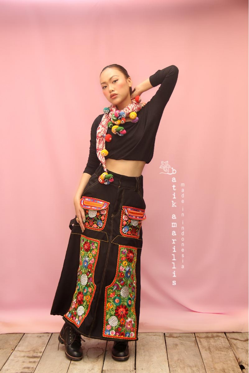 invigorating double knee painter skirt which is inspired by denim workwear pants. Feats strap at the waist. Our new embroidery design with 'Hysteria on Wisteria’ such as orchid, luscious pomegranate, exotic sugar/custard apple also some classic folk Hungarian embroidery design on black gabardine