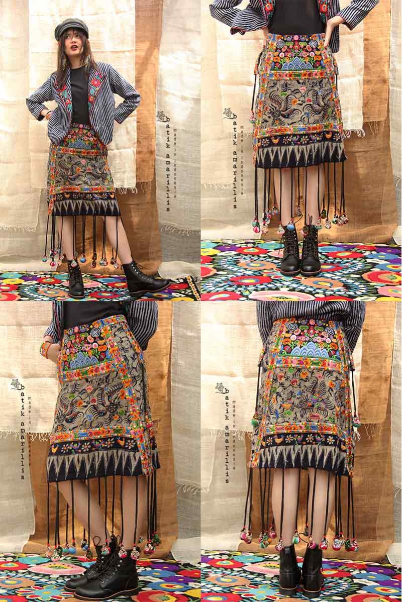 Such a quirky skirt with complicated details such a hand drawn batik on hand woven Tuban, with Hungarian embroidery motifs plus our trademark ‘ Lollies’ then all of them blended seamlessly & harmoniously