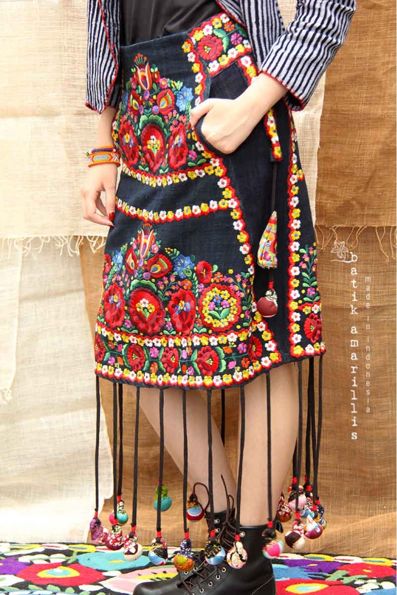 Such a quirky skirt with complicated details such a hand woven indigo, with Hungarian embroidery motifs plus our trademark ‘ Lollies’ then all of them blended seamlessly & harmoniously