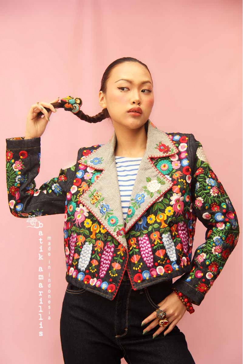 features embroidery & embellishment: beads and sequins on denim, gorgeous double breasted crop jacket is the retro fix from Batik Amarillis’s. Looking back the kind of style you’d see on the street in the 80s & 90s, Style yours with a printed tee & directional heels for an inherently fresh city look