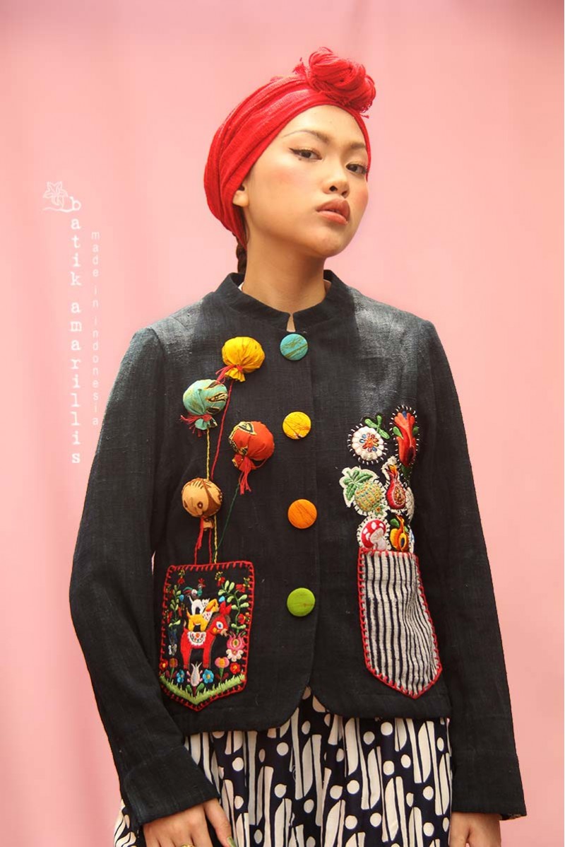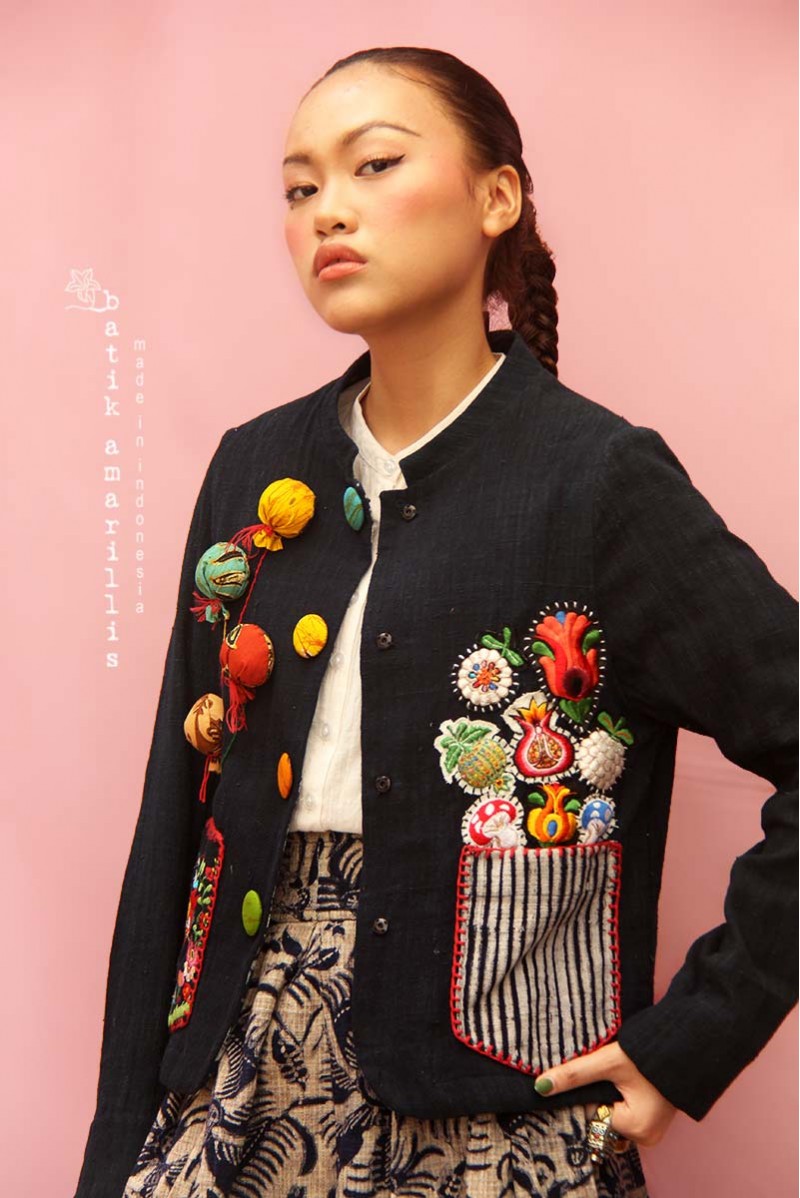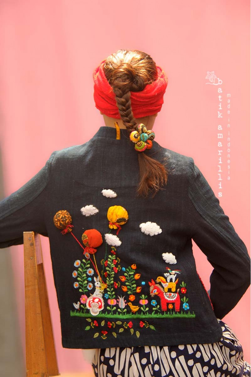 check the inner secret pocket inside! made by natural indigo dyeing with ‘ daun tom ‘ (local name for Indigofera tinctoria) on tenun gedog/ hand woven in Tuban, East Java plus super adorable fable embroidery ,Hungarian Camellia flower and balloons appliqué, colorful hand made batik buttons.