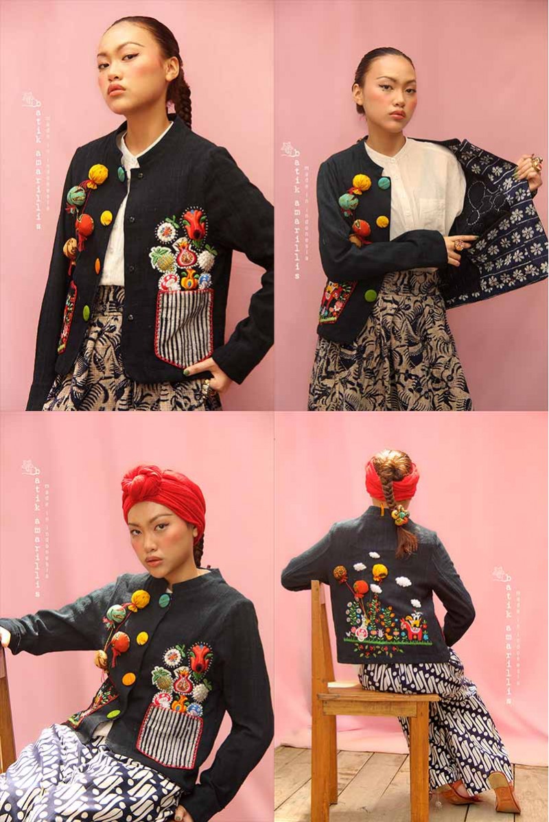 check the inner secret pocket inside! made by natural indigo dyeing with ‘ daun tom ‘ (local name for Indigofera tinctoria) on tenun gedog/ hand woven in Tuban, East Java plus super adorable fable embroidery ,Hungarian Camellia flower and balloons appliqué, colorful hand made batik buttons.