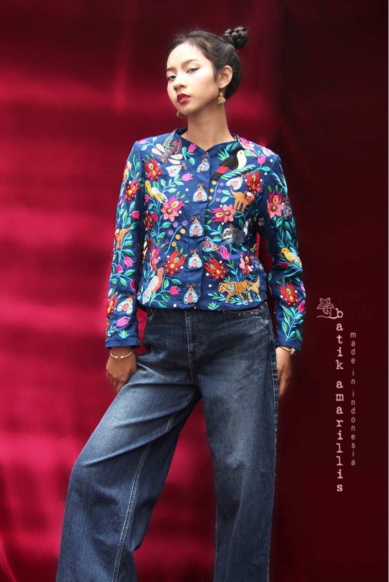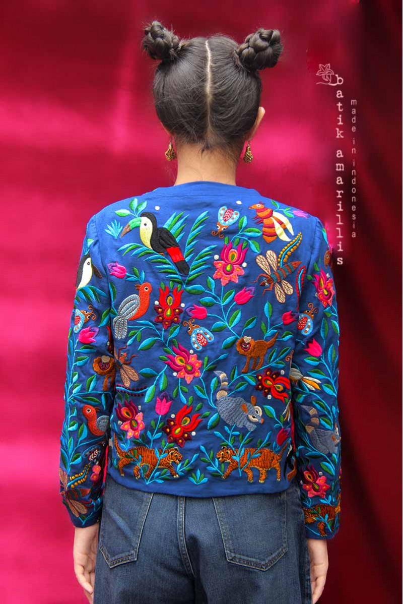 Feel great and look great in this collarless round neck biker jacket inspired, features a harmonious blend of charms & intricate craftsmanship detail fauna and floral embroidery on Royal blue Linen!