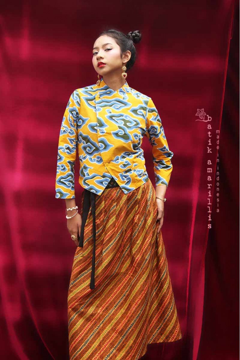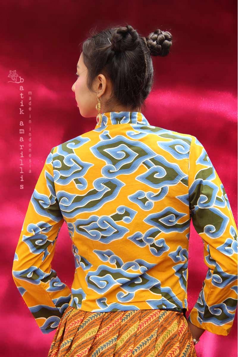 Traditional Javanese men cropped jacket inspired, with its compact & slimming silhouette. Wear it over high waisted pants/ skirt/sarong also you can open the button and the look will change into laid back style! Features hand drawn batik Cirebon mega mendung