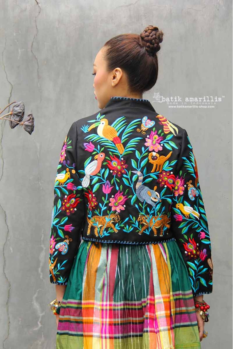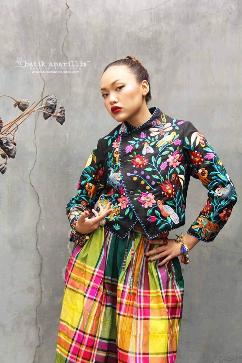 Traditional Javanese men cropped jacket inspired, with its compact & slimming silhouette. Wear it over high waisted pants/ skirt/sarong also you can open the button and the look will change into laid back style! Features exotic fauna embroidery on black gabardine