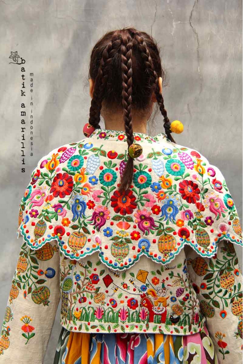 crafted from hand woven, features a romantic capelet overlay, charming silhouette beautiful intricate Hungarian embroidery motifs inspired, a front zipper closure plus our signature ‘batik lollies’. Those detailing evoke ethereal, feminine charm