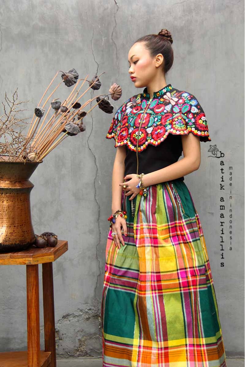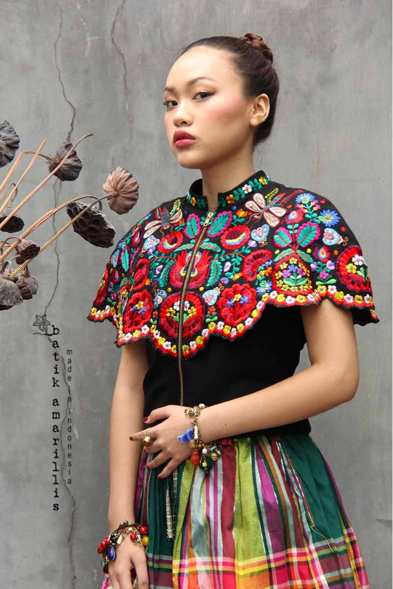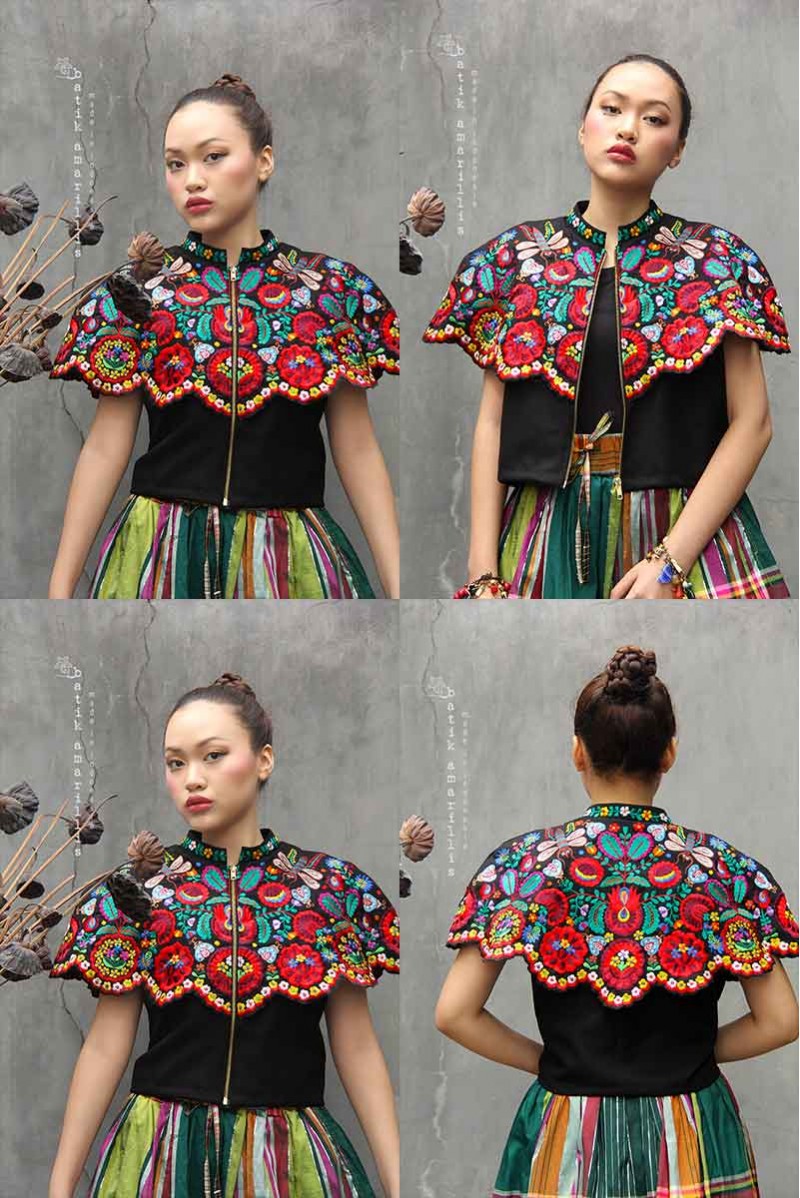 crafted black gabardine features a romantic capelet overlay, charming Hungarian embroidery motif inspired and a front zipper closure, Its charming silhouette and intricate embroidery detailing evoke ethereal, feminine charm
