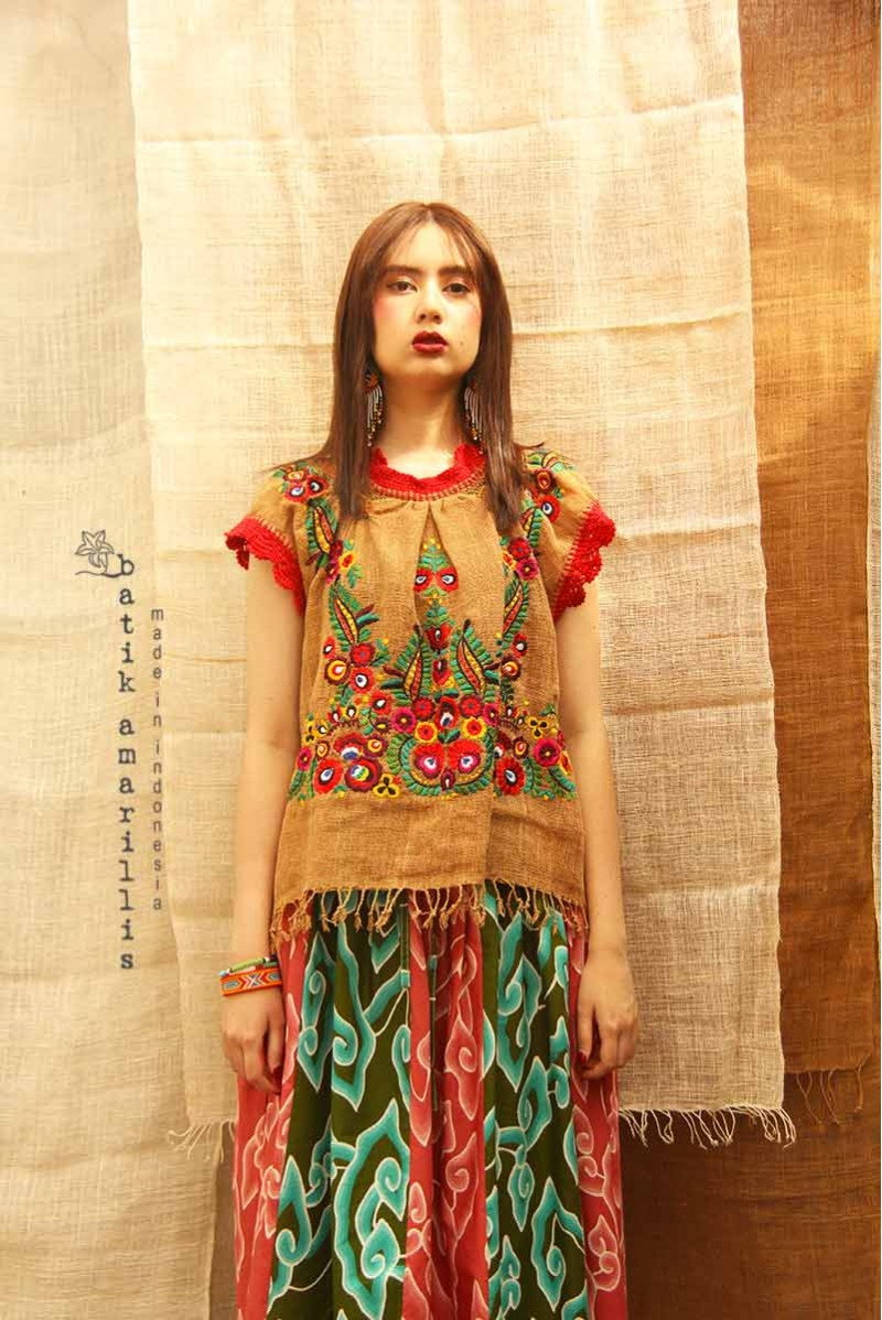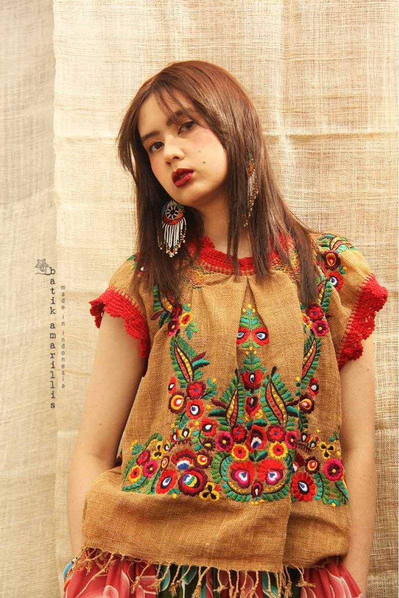 meet Hajnalka, beautiful & romantic folk inspired blouse with hand smocked, crocheted and hand knitted plus, Hungarian embroidery style on raw and exotic hand woven Indonesia’s traditional textiles, this piece you can wear it as layer of your shirt or T shirt