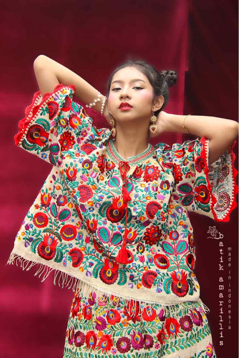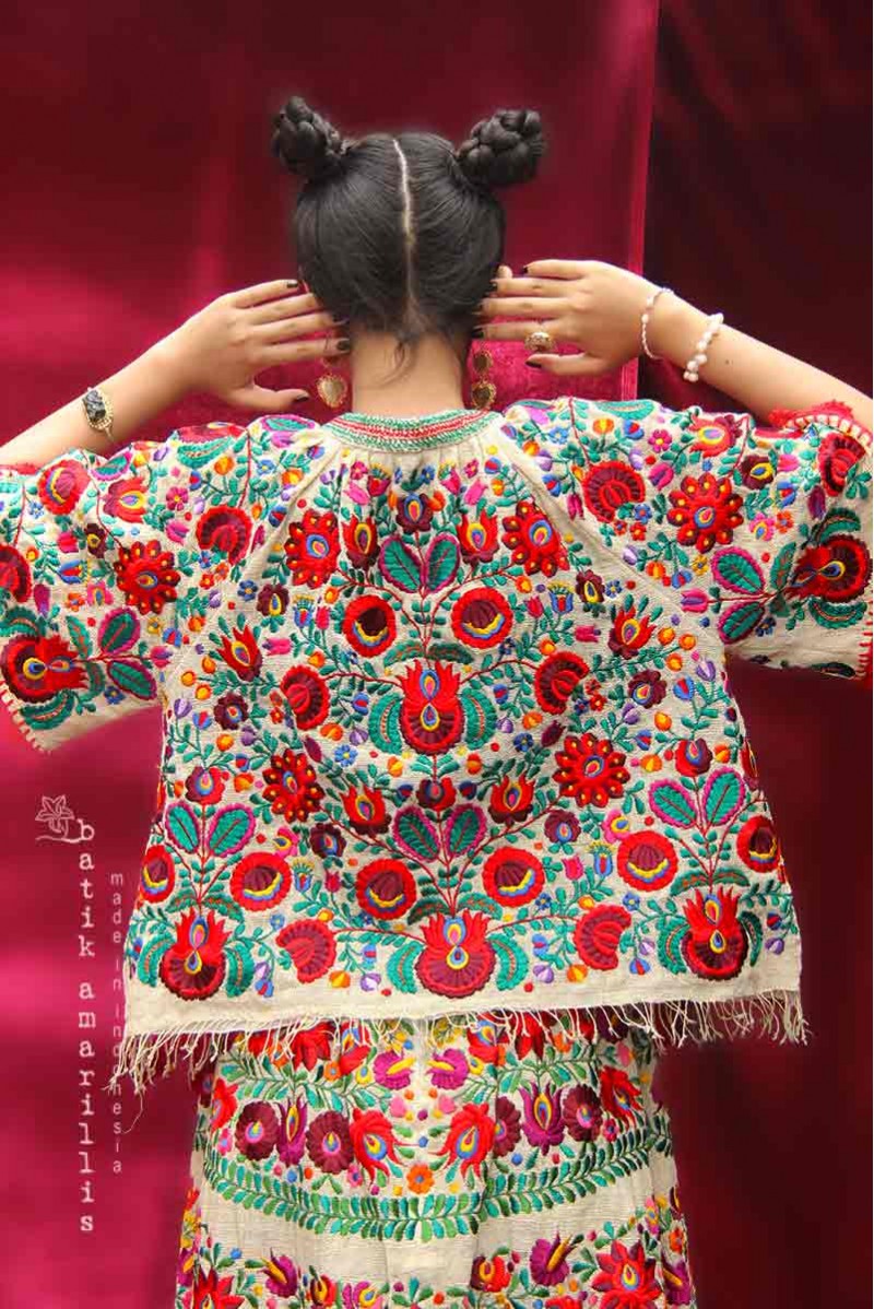 A blend of elegance and intricate craftsmanship, Features Hungarian’s Matyo embroidery motif on hand woven gedog seseran of Tuban with tie closure plus smocked neck and hand crocheted