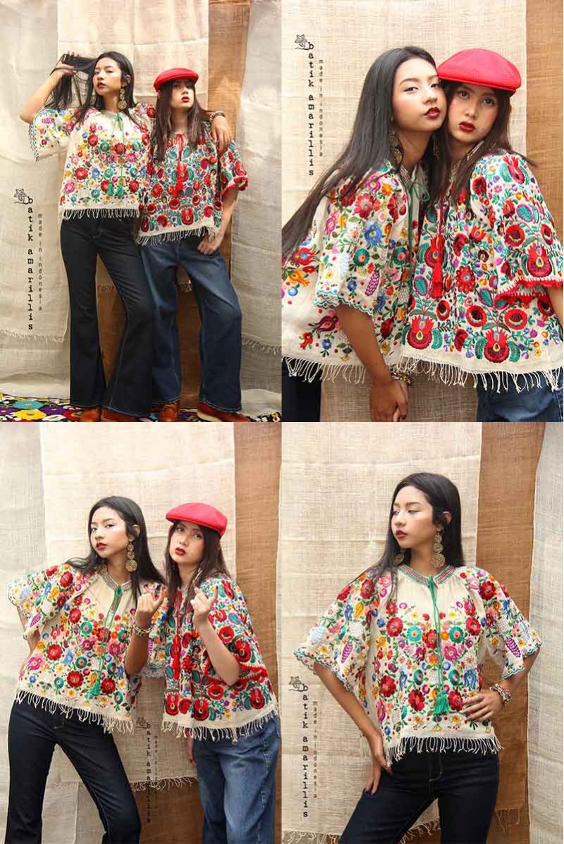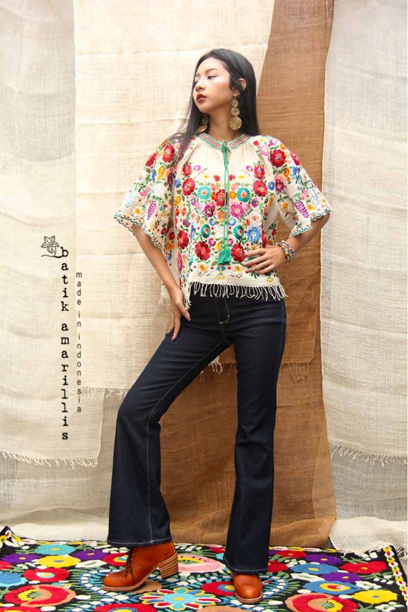A blend of elegance and intricate craftsmanship, Features Hungarian’s Matyo embroidery motif on hand woven gedog seseran of Tuban with tie closure plus smocked neck and hand crocheted